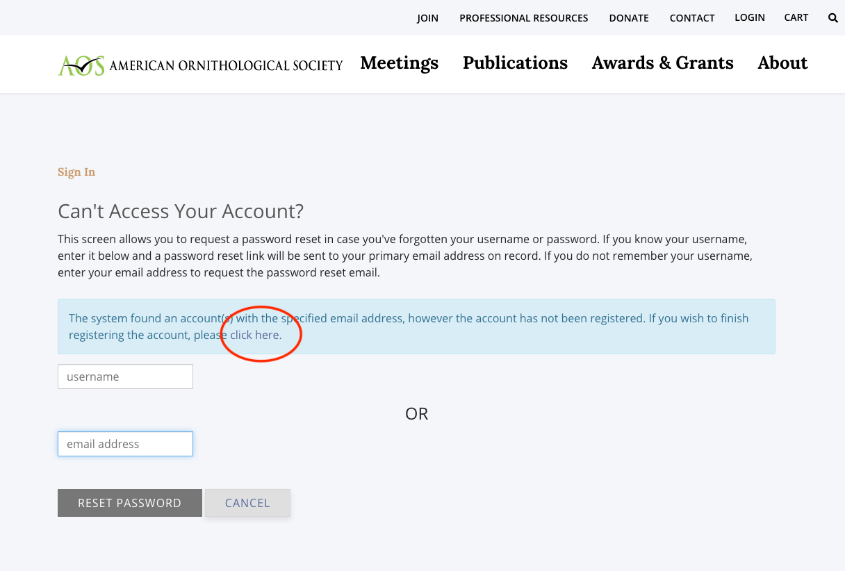 3. A message will appear indicating that your account already exists. Click the link to finish registering your account.