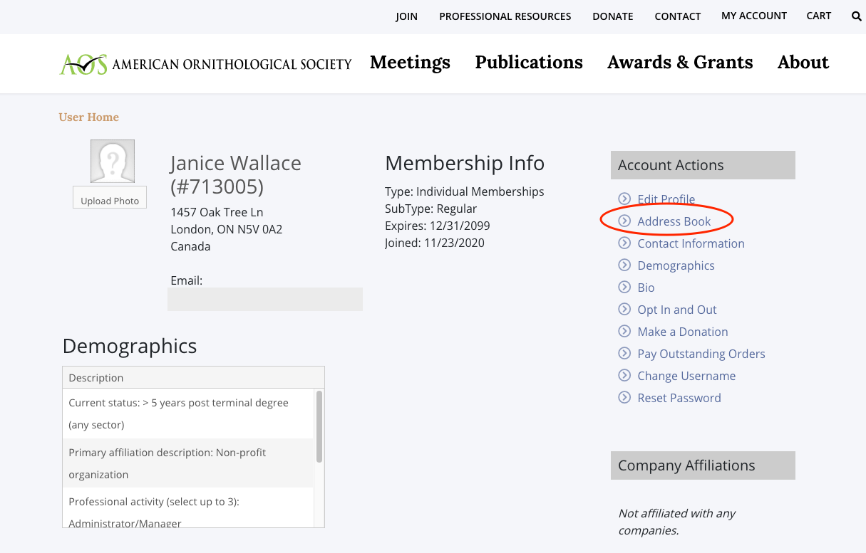 1. Click “Address Book” under the Account Actions menu on the right side of the User Home page.