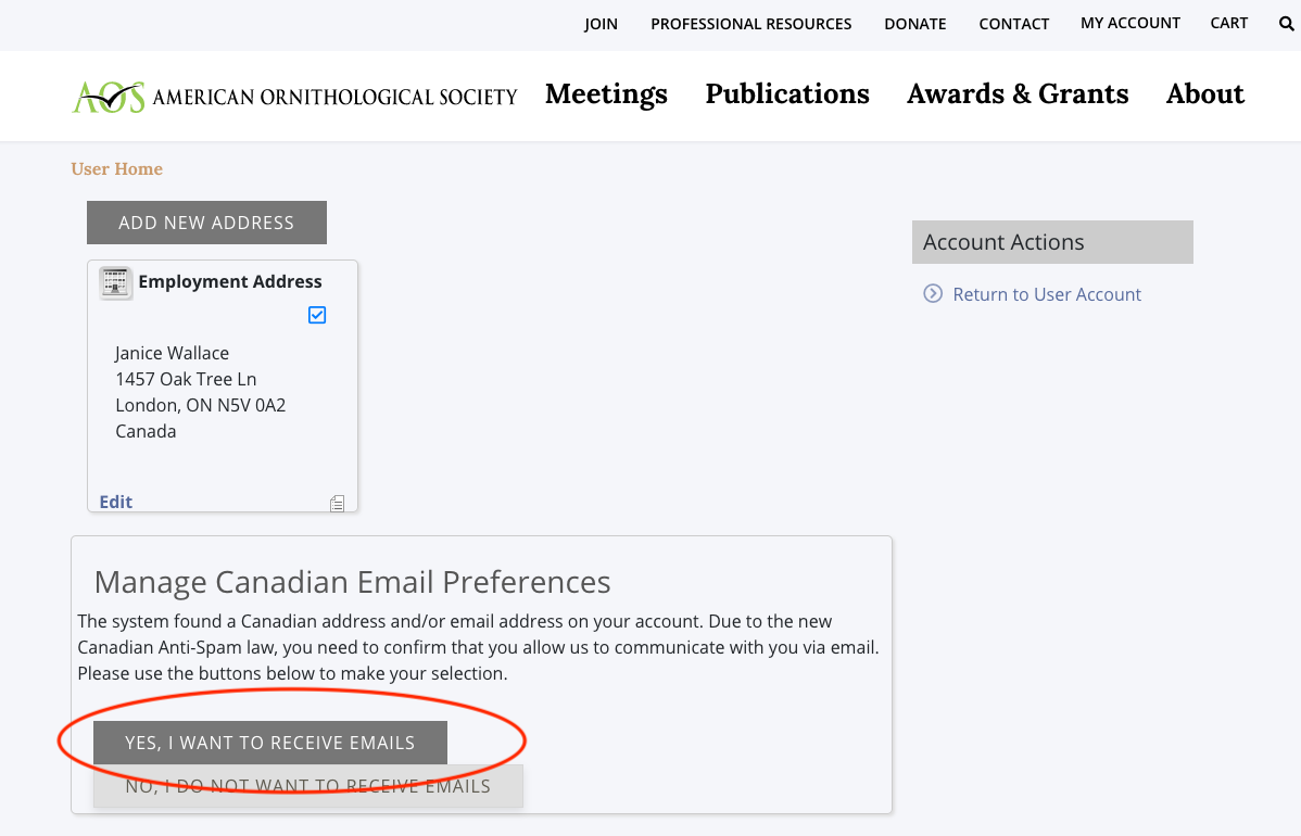 2. Click “Yes, I want to receive emails” in the Manage Canadian Email Preferences Box.